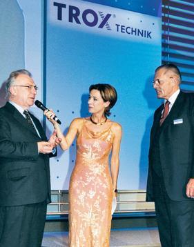 Düsseldorf 2001: De TROX GROUP viert zijn 50e verjaardag met een grote ceremonie. Het evenement wordt begeleid door de Duitse tv- en radiopresentator Sabine Sauer, hier te zien in een interview met Lothar Späth, de voormalige minister-president van de deelstaat BadenWürttemberg, nadat hij een toespraak heeft gehouden ter ere van Heinz Trox. Heinz Trox luistert aandachtig naar wat Lothar Späth te zeggen heeft over TROX