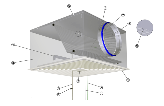 Plafondroosters met vierkant frontrooster. Als toevoer- of afvoerluchtrooster voor comfortinstallaties. Frontrooster met vaste lamellen voor horizontale vierzijdige luchtuitblaas. Voor inbouw in alle soorten verlaagde plafonds.