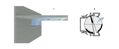 | Instelling luchtuitblaas | Luchtstroming met plafondinvloed |